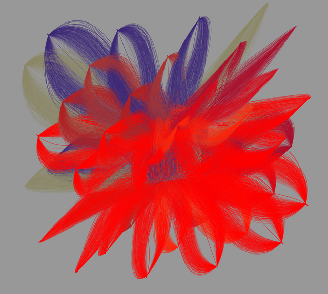 Die hier gezeigte Darstellung und die vorangehende Abbildung zeigen, wie unterschiedlich die Visualisierungen ausfallen können, je nachdem, wie der ihnen zugrunde liegende Algorithmus die zur Verfügung stehenden Formelemente auswählt: Obwohl die eingespeisten Daten identisch sind, werden sie durch den Algorithmus in verschiedene grafische Elemente „übersetzt“.