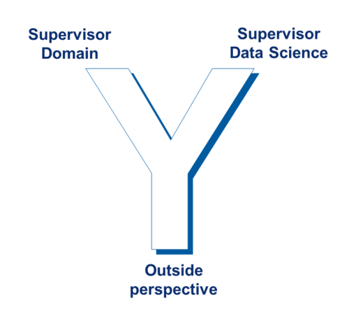 IDEAS setzt auf das Y-Supervisionsmodell: Jedes Promotionsprojekt wird gemeinsam von mindestens zwei Principal Investigators (PIs) aus unterschiedlichen Partnerinstitutionen betreut, die jeweils unterschiedliche fachliche Perspektiven einbringen – in der Regel Datenwissenschaft und Domänenexpertise.